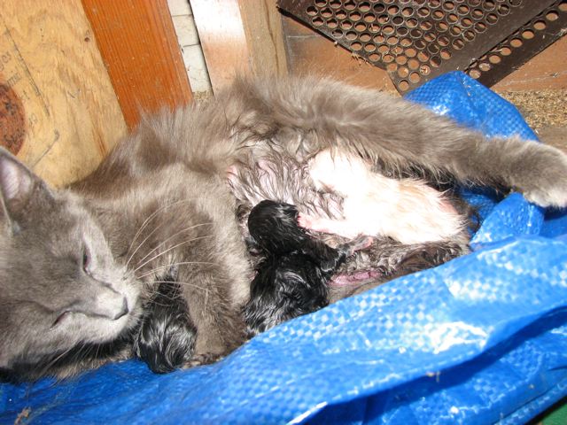 We suspected that Kid was pregnant, and we were right! Kid gave birth to 3 cute kittens in our garage last night. She snuck in there yesterday evening, and refused to come out. This morning I found objects strewn all over the garage, as she was looking for just the right place to have her kitties. 2 black and 1 white kitten were with mom underneath my workbench on a blue Ikea bag/tarp. Addilyn is very excited to be a new big sister of 3 little kittens! We are leaving them alone today, but I am going to provide a box for her in case she wants some privacy. Also, this will help to keep them from wandering around the garage where there are chemicals, fertilizer, and a car. We plan to raise them until they are weaned, and either they will explore and leave the nest on their own, or we will have to find homes for them. I will keep you updated on their developmental progress and milestones as the cute, fuzzy kittens grow up! This will be very exciting for Addilyn!