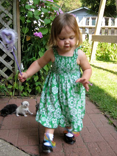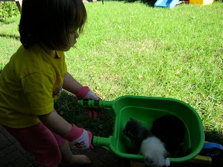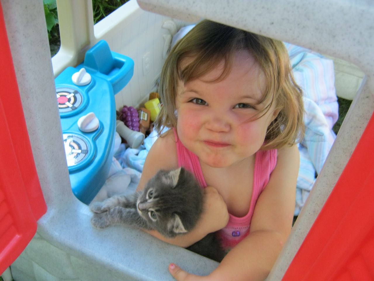Thank you Grandma Judy & Grandpa Bruce for bringing up the playhouse and making such a beautiful picnic table. If we could play outside 24 hours a day, we would now! Our backyard has become so much more fun. At every mealtime now, we get to have a picnic on our table on our back porch! And of course, the kitties love the playhouse, too!
