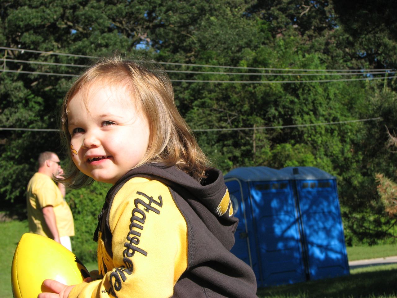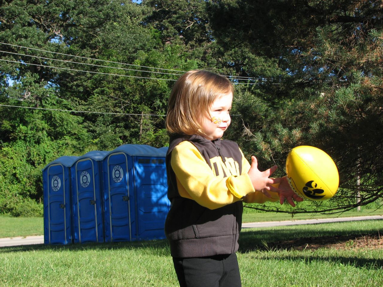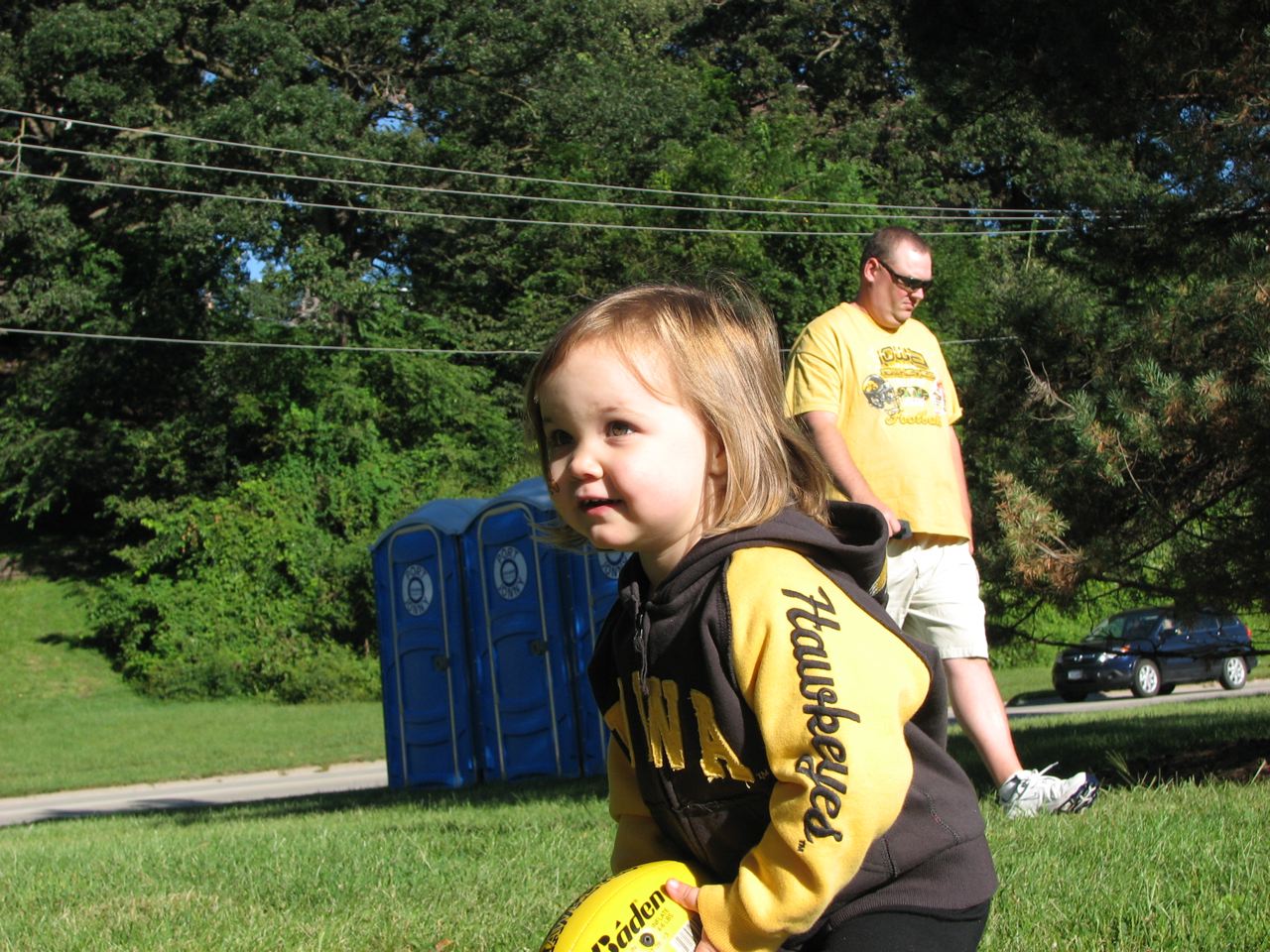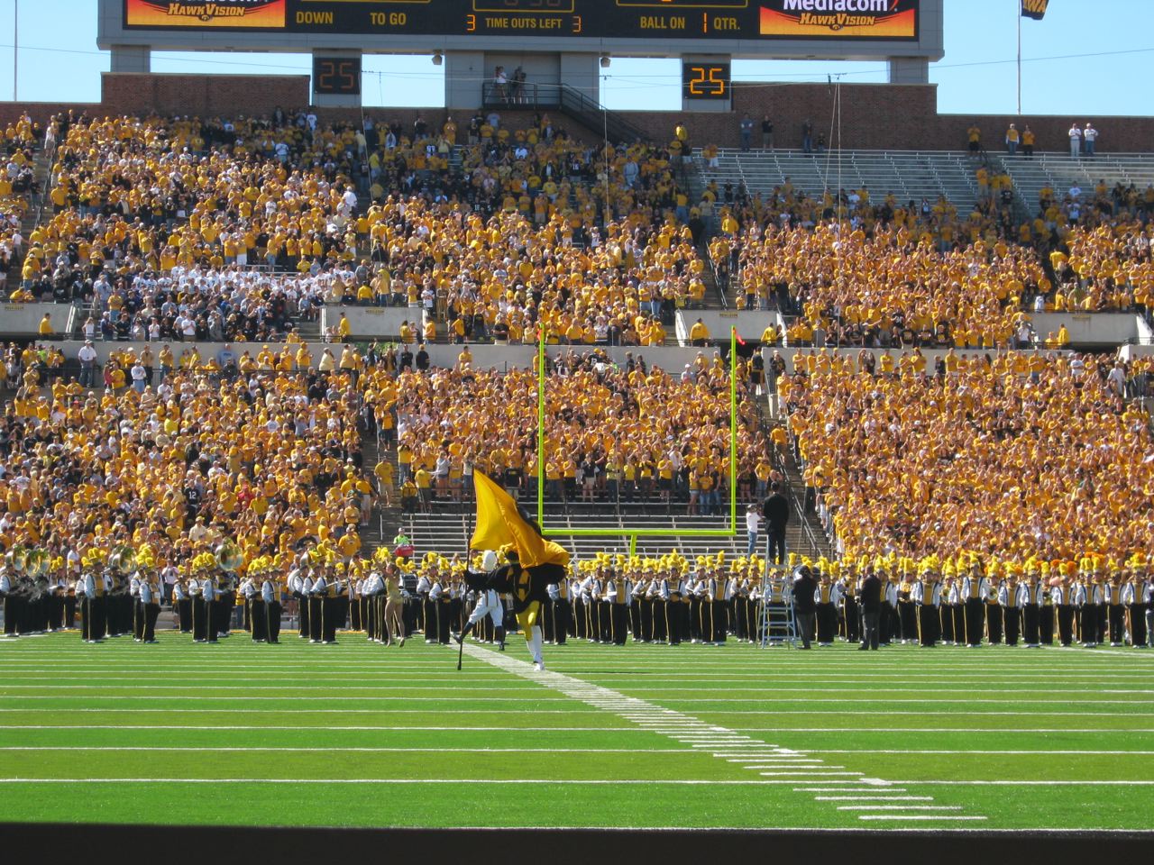 Today was Herky game day! Addilyn went to the game and the Hawks won! I think Papa, Grandma, and Grandpa had a great time, too. We sat in ROW 1 on the field! Best seats, ever. Herky came by several times, but Addilyn was terrified of him. She cried every time he came near, so we weren't able to get a picture taken with him. When we left the game, I asked her if she would ever get her picture taken with Herky. She said, "Maybe next year." GO HAWKS!