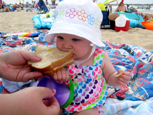 Stella's first Bologna sandwich on the beach!
